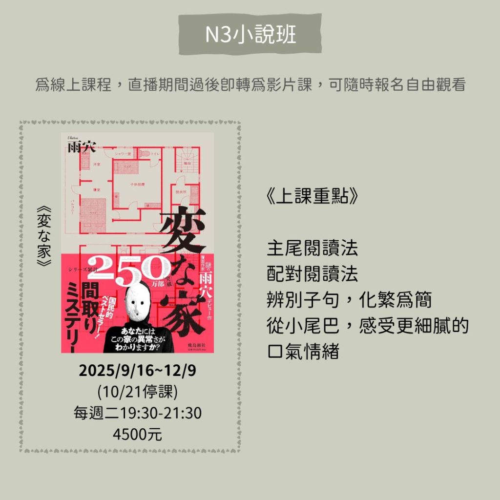 文章中提到的例句出自N3小說班〈変な家〉這一堂,這本書因為都是對話組成,句子相對簡單,很適合想換個教材的同學來試水溫,而且故事真的很精彩!會讓人很想一直往下看!
